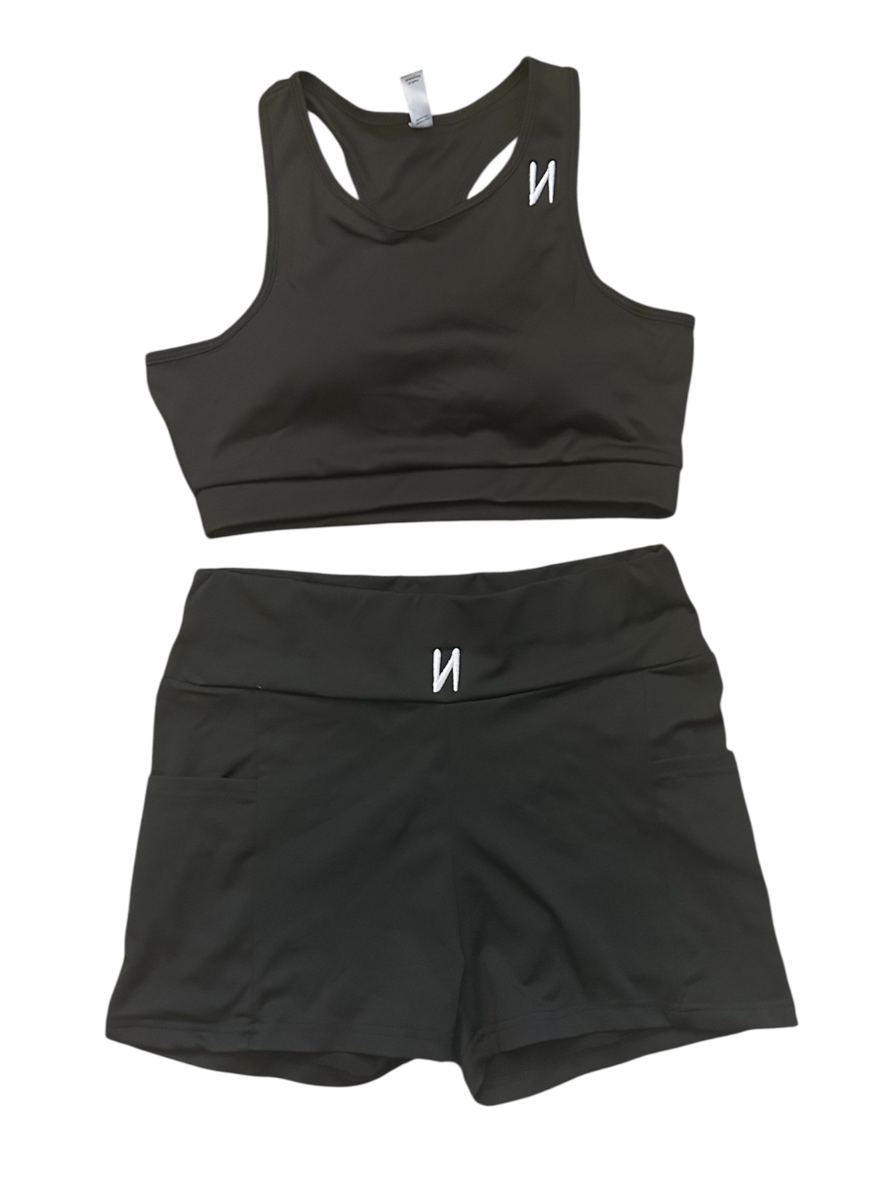Embroidered black spandex Sport Bra and shorts with pockets. Athletic made for the gym, sports, and active wear.